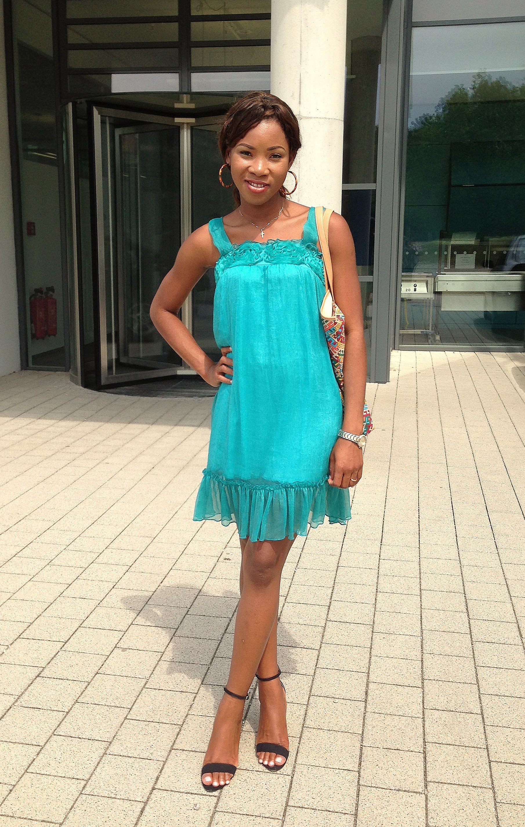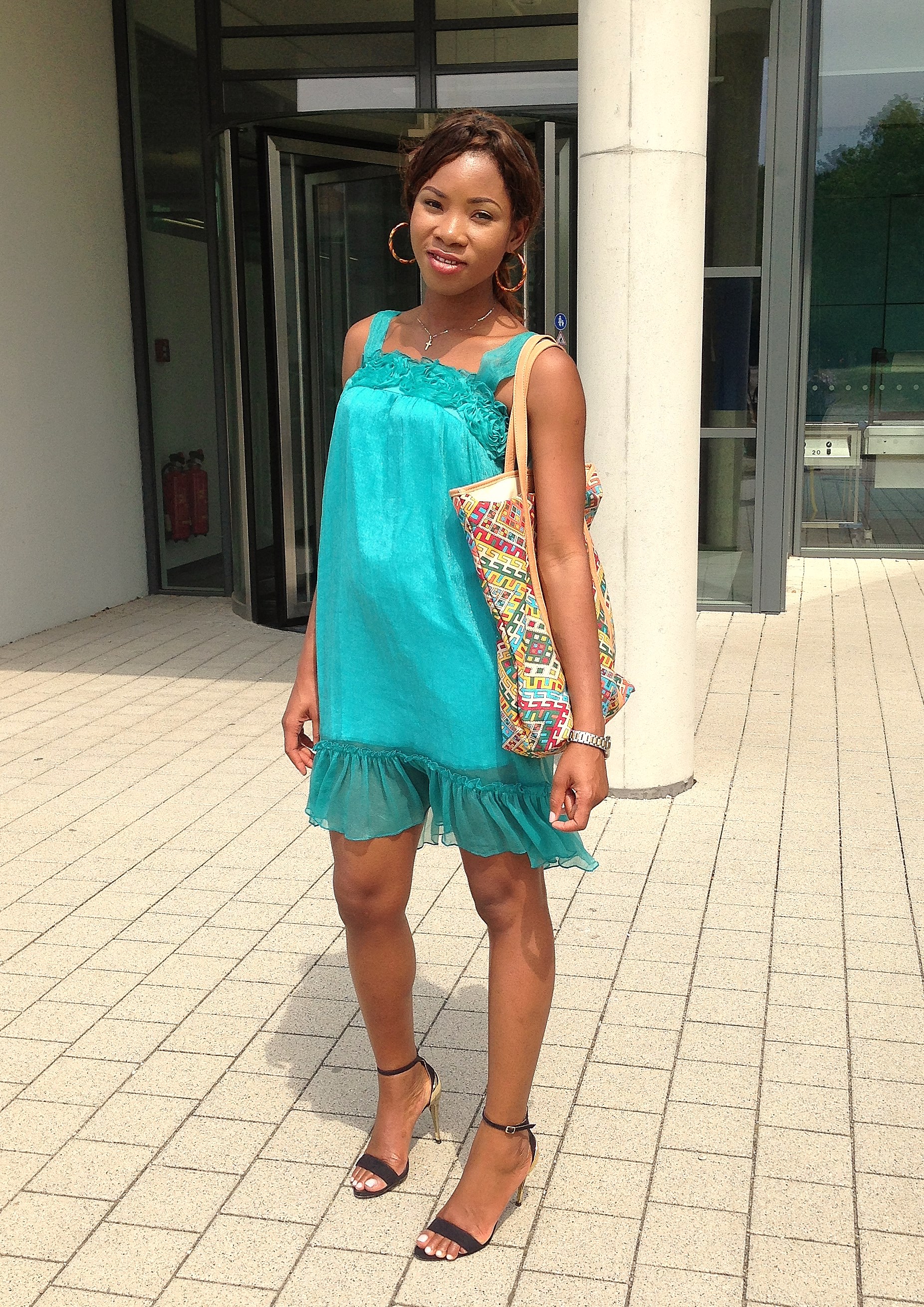 I wore this outfit for an outing with my family. The multi-coloured maxi bag was the main focus and for something casual, comfortable and fun I decided to wear a blue gown.