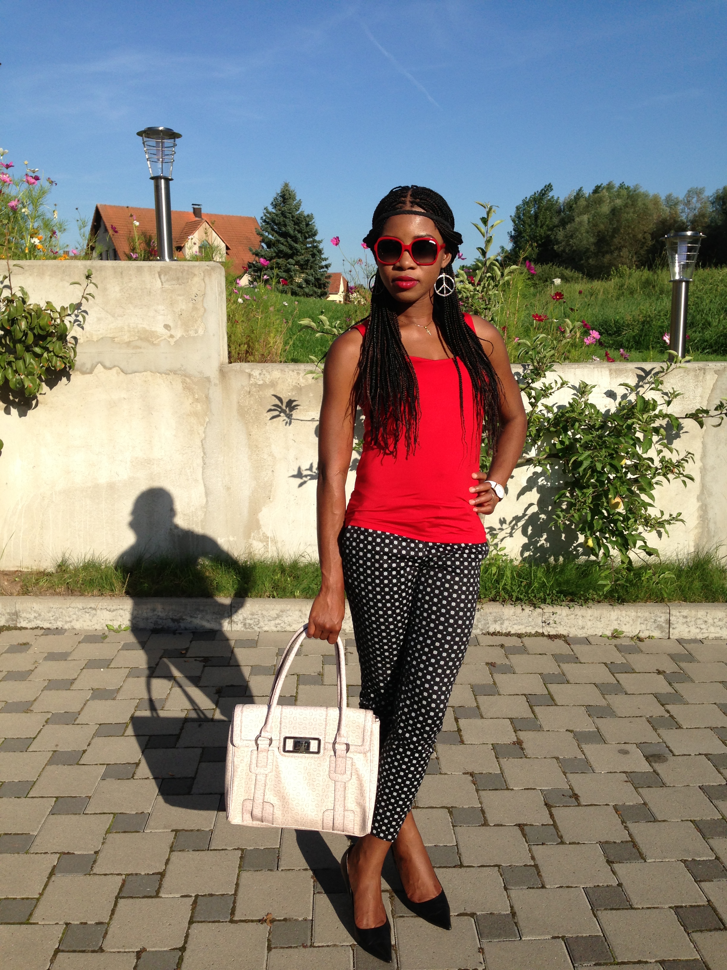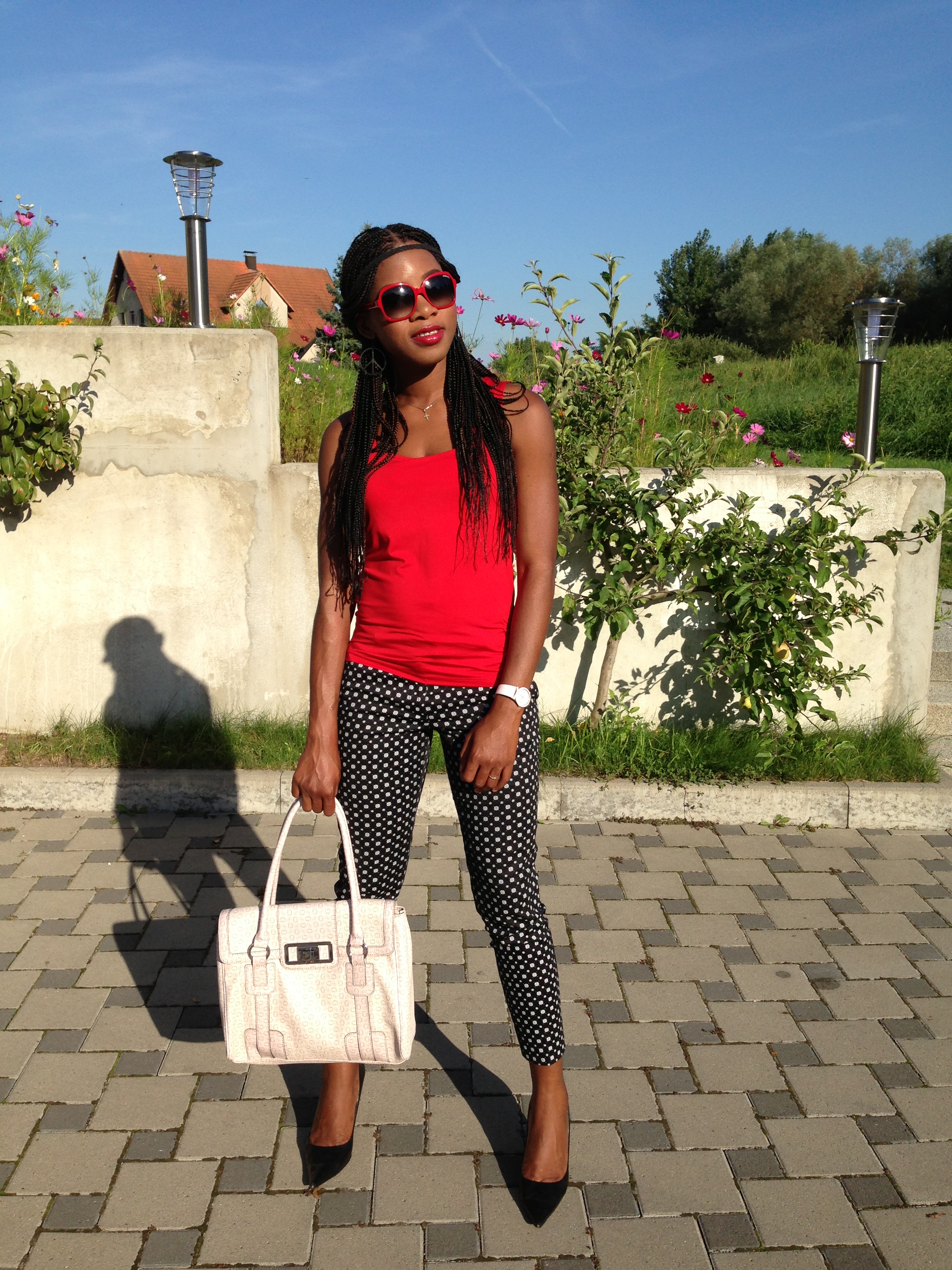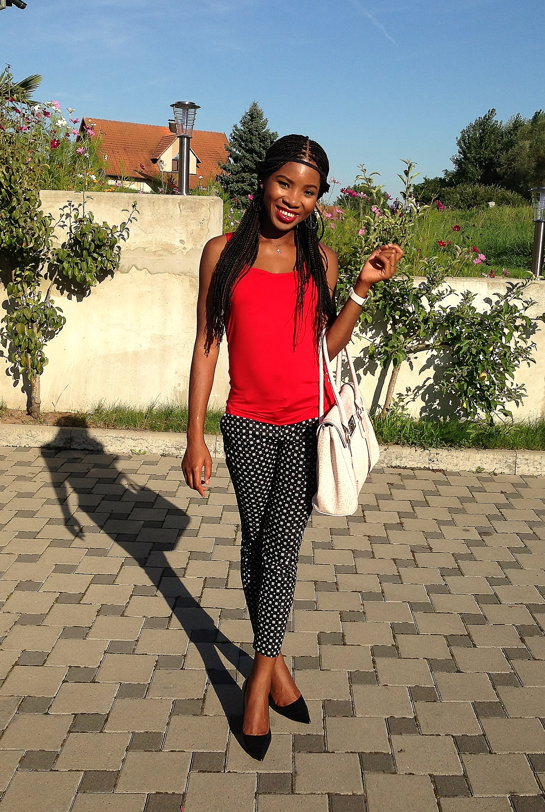 Black & White combinations are lovely. For this post, I am wearing a black and white polka dot trouser from H&M and for some touch of colour I added a red top. The simplicity of the outfit captured my eyes including the comfort it provides.
