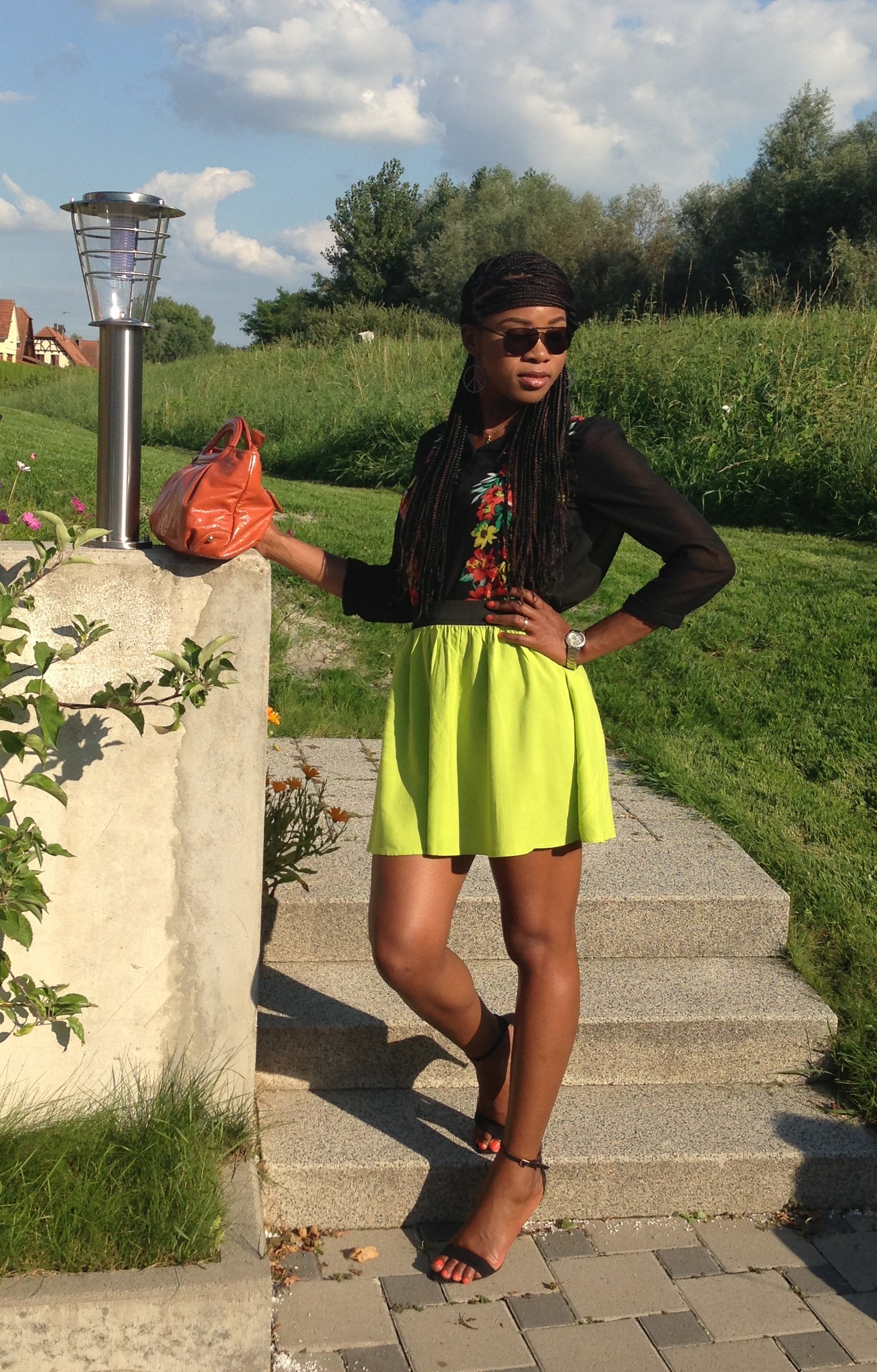 Working with the feminine look, I added this floral shirt (worn in previous post with a yellow short). love the floral details on the shirt and this time I decide to wear it with a neon green Skirt.