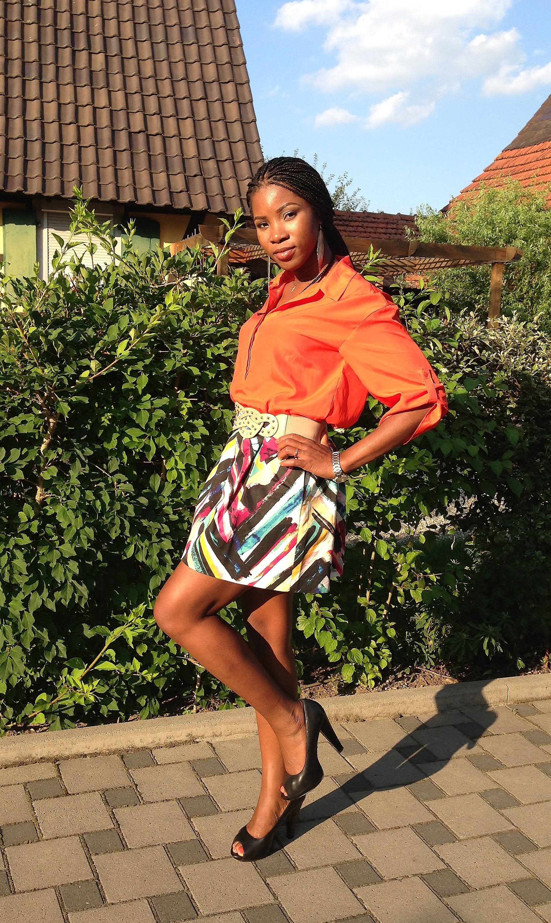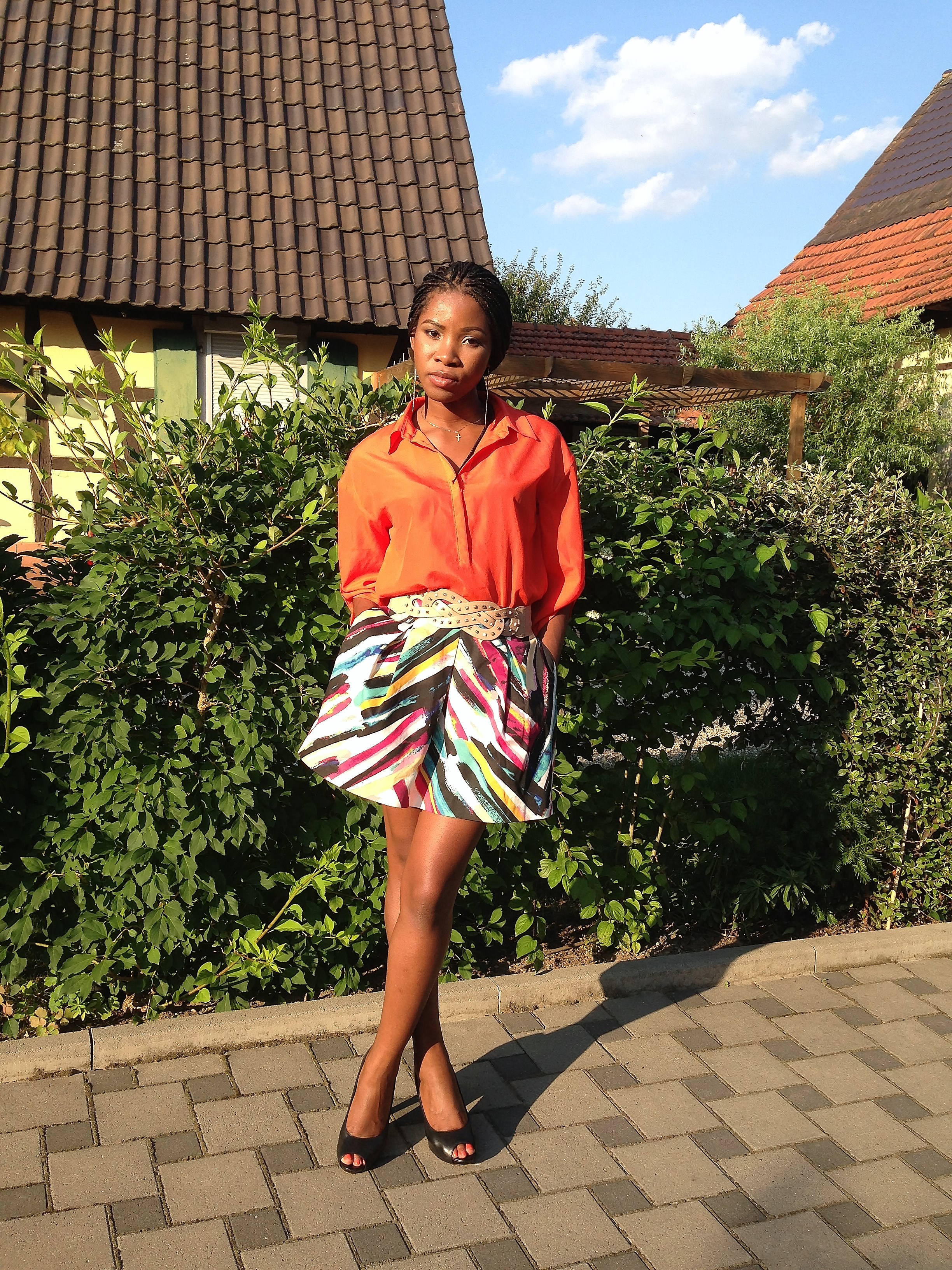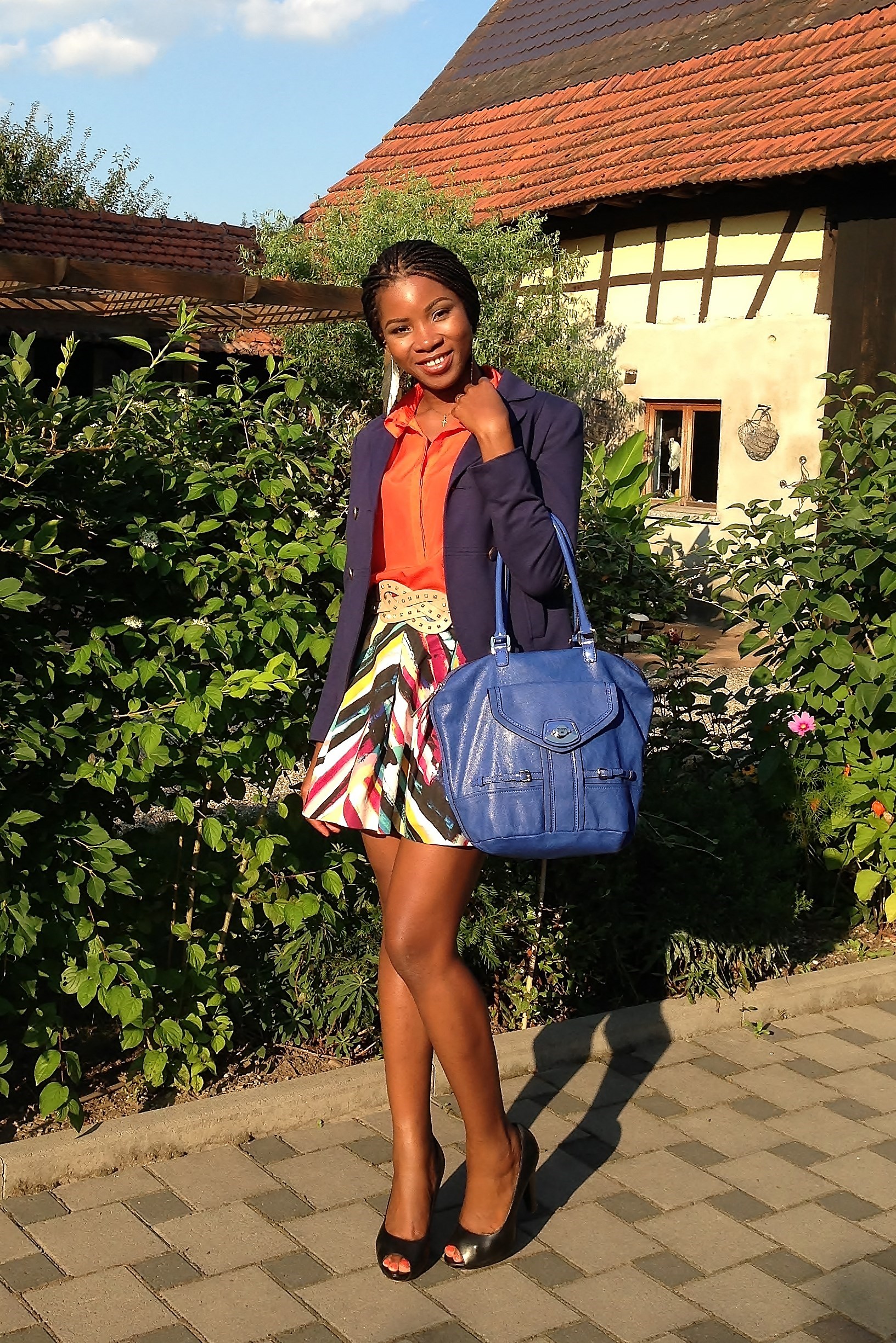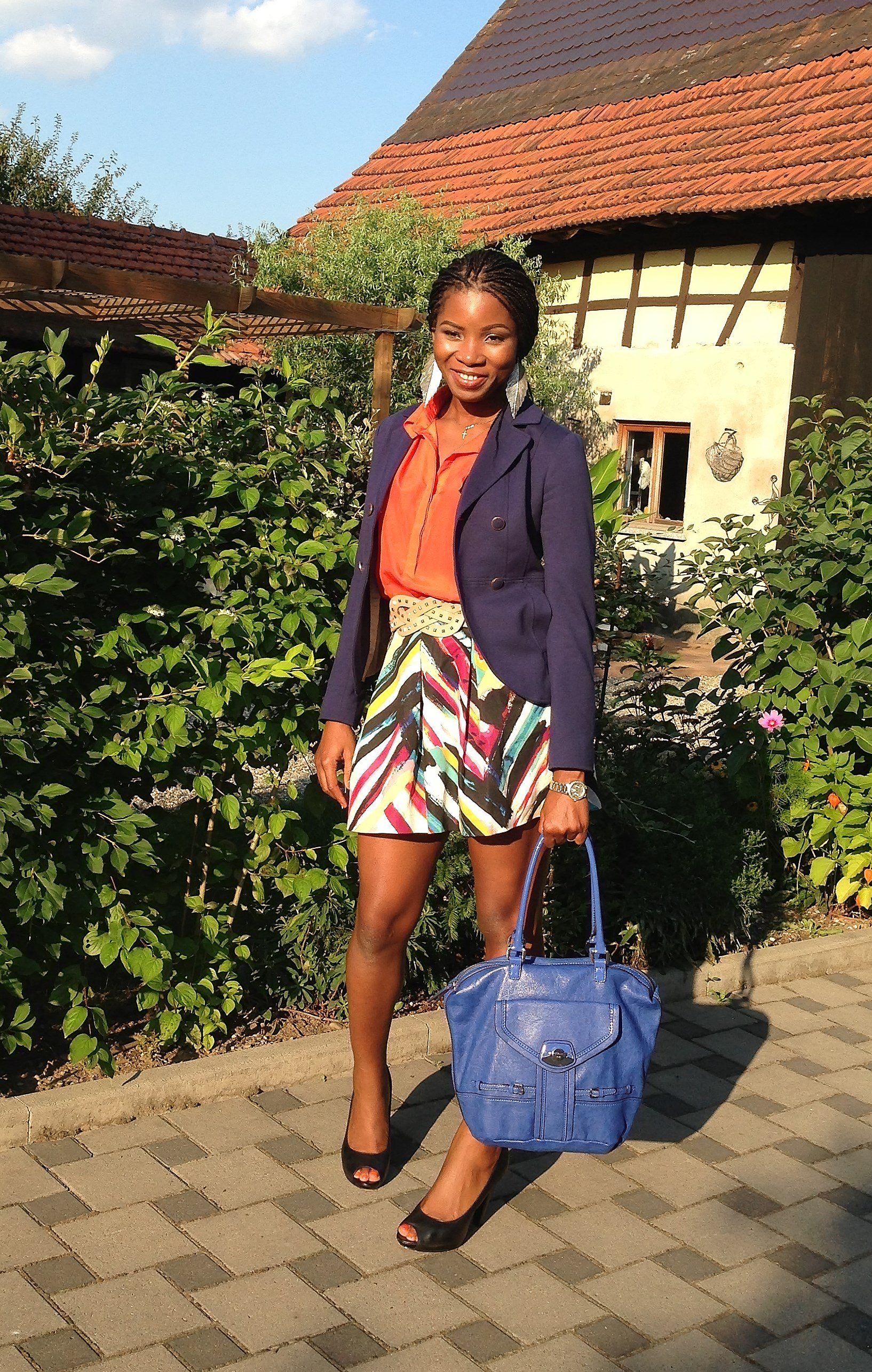 Today’s outfit is bright and loud! Most times, I love to style outfits around statement pieces i.e. shoes, tops or bottoms. For this outfit, the main focus is the skirt and I added the other colours to work with it. I love the pattern and art work on the skirt and I completed the look a blue blazer and a black pumps.
