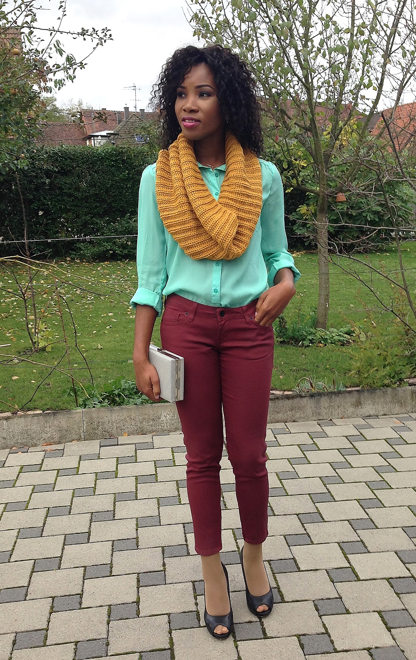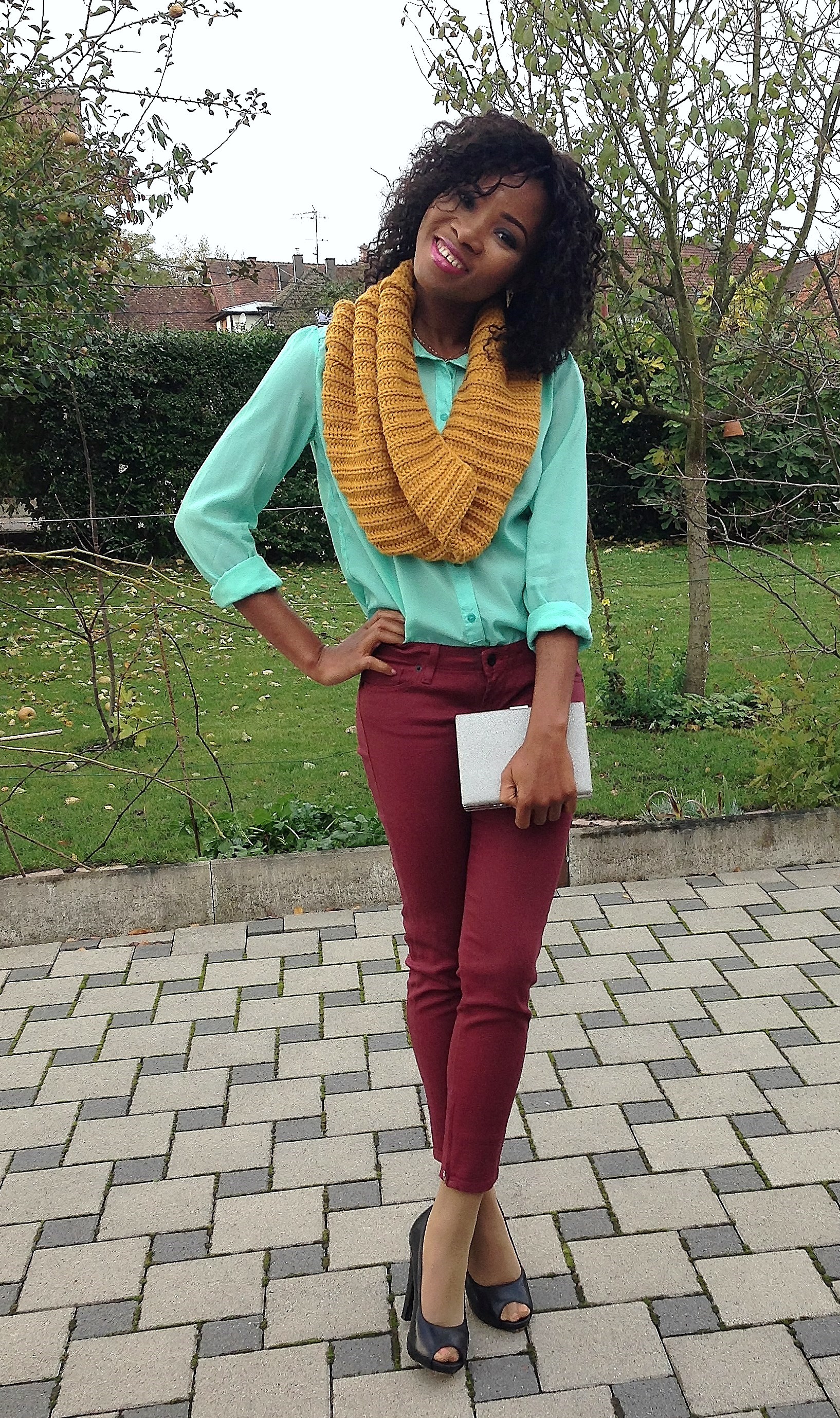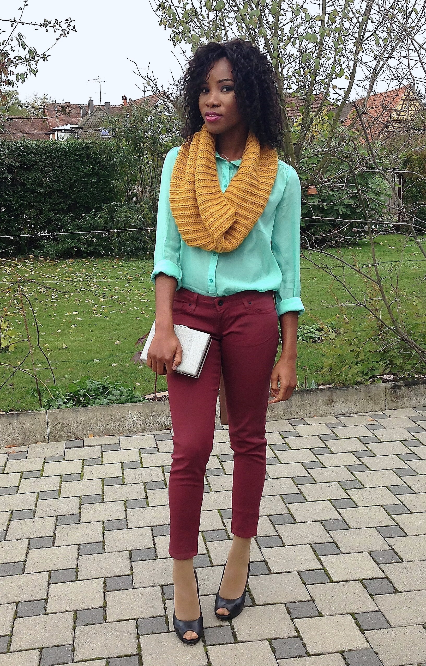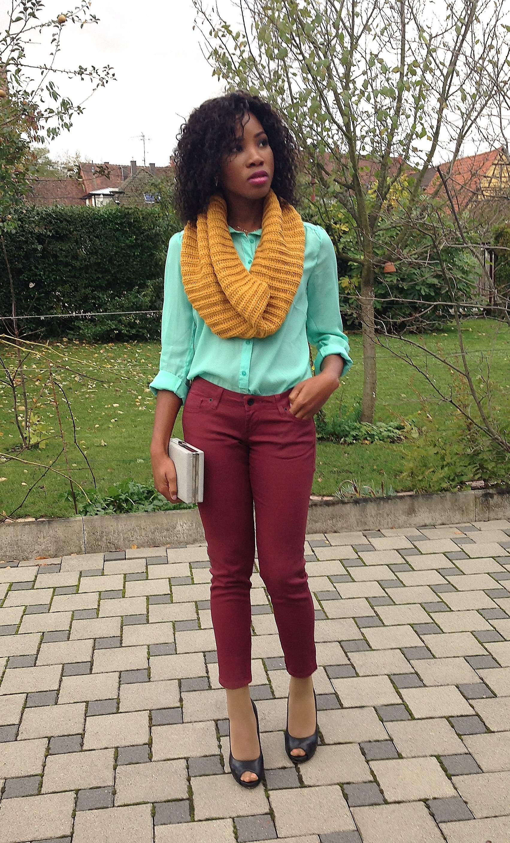 Burgundy and mustard bring out the spring and winter in me, but of course for my love for bright colours and always having a twist in my outfit, in this post is my mint shirt. I love bright colours and I wear them in all seasons. I complemented the look with this lovely silver clutch and a black pumps. I will say, this is my spring/winter colour blocking. I kept my jewelleries simple.