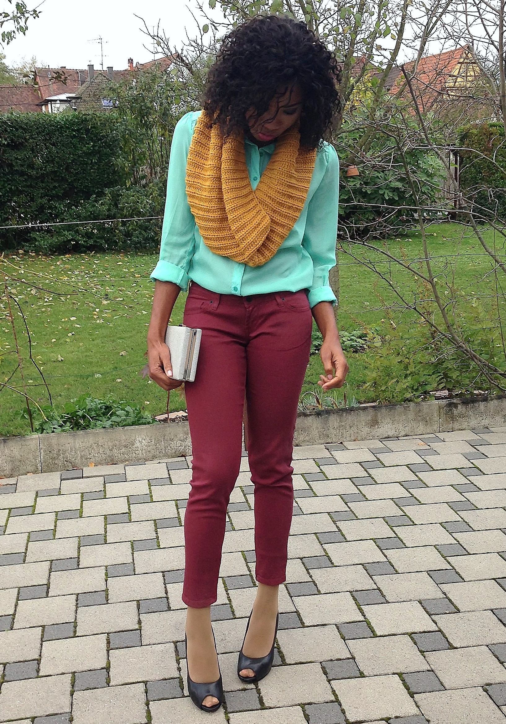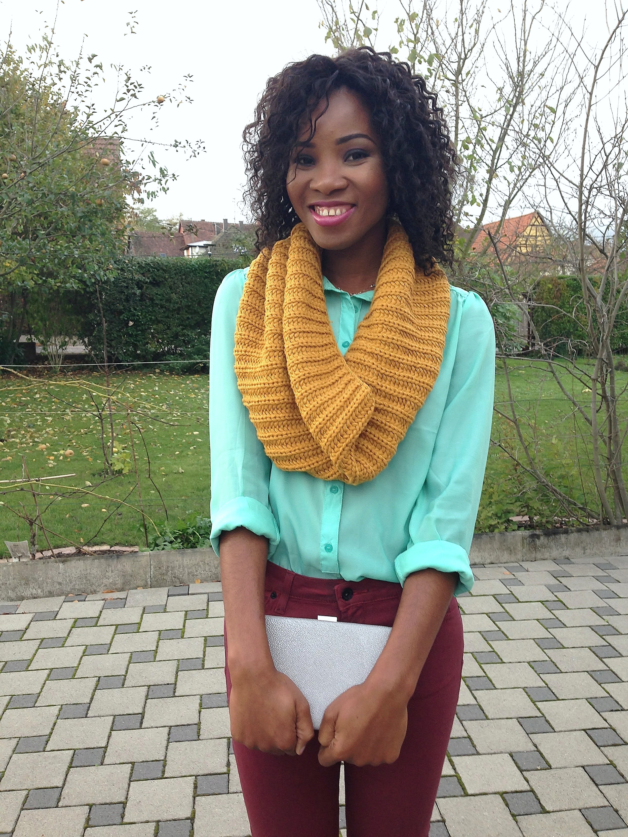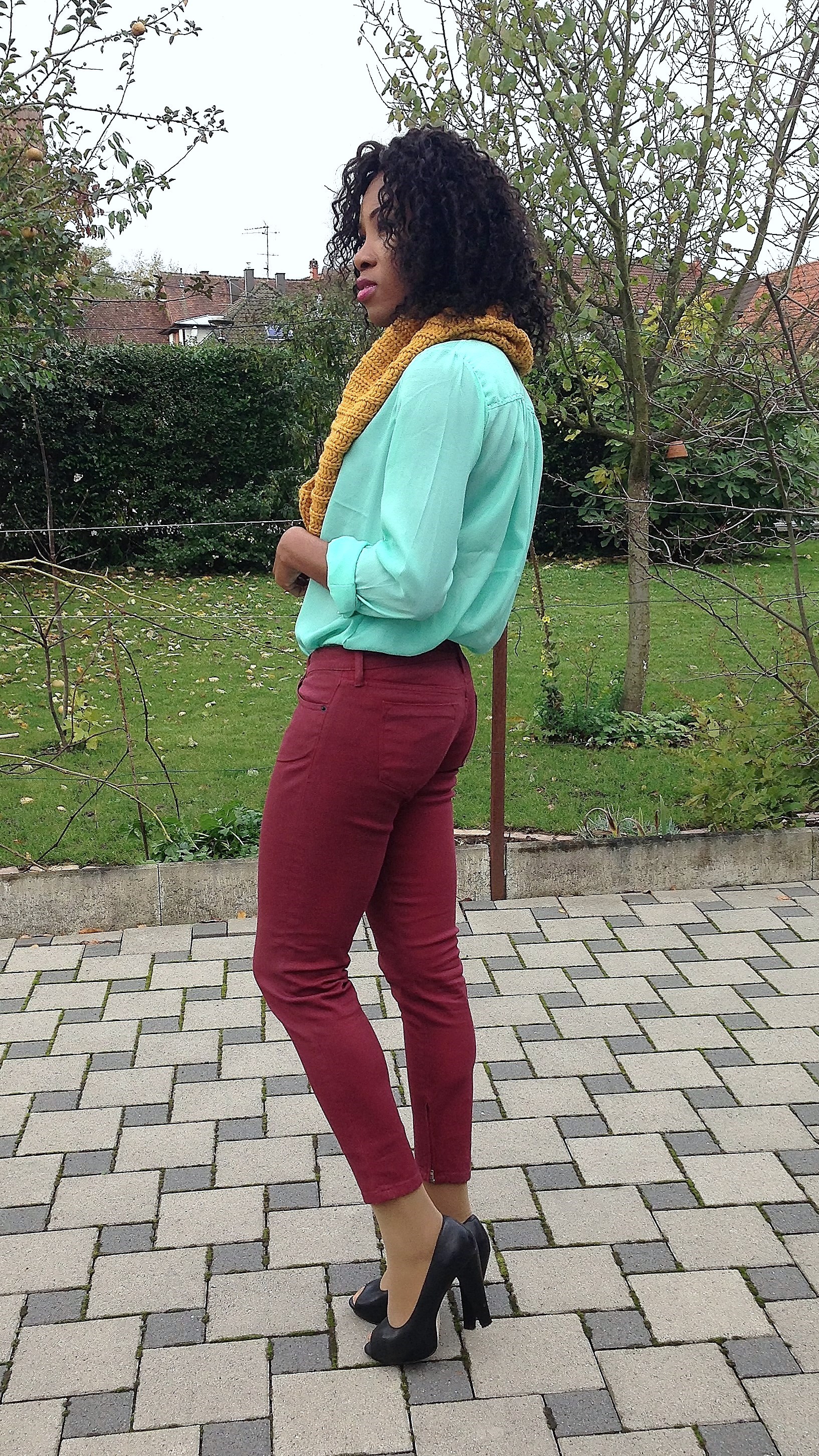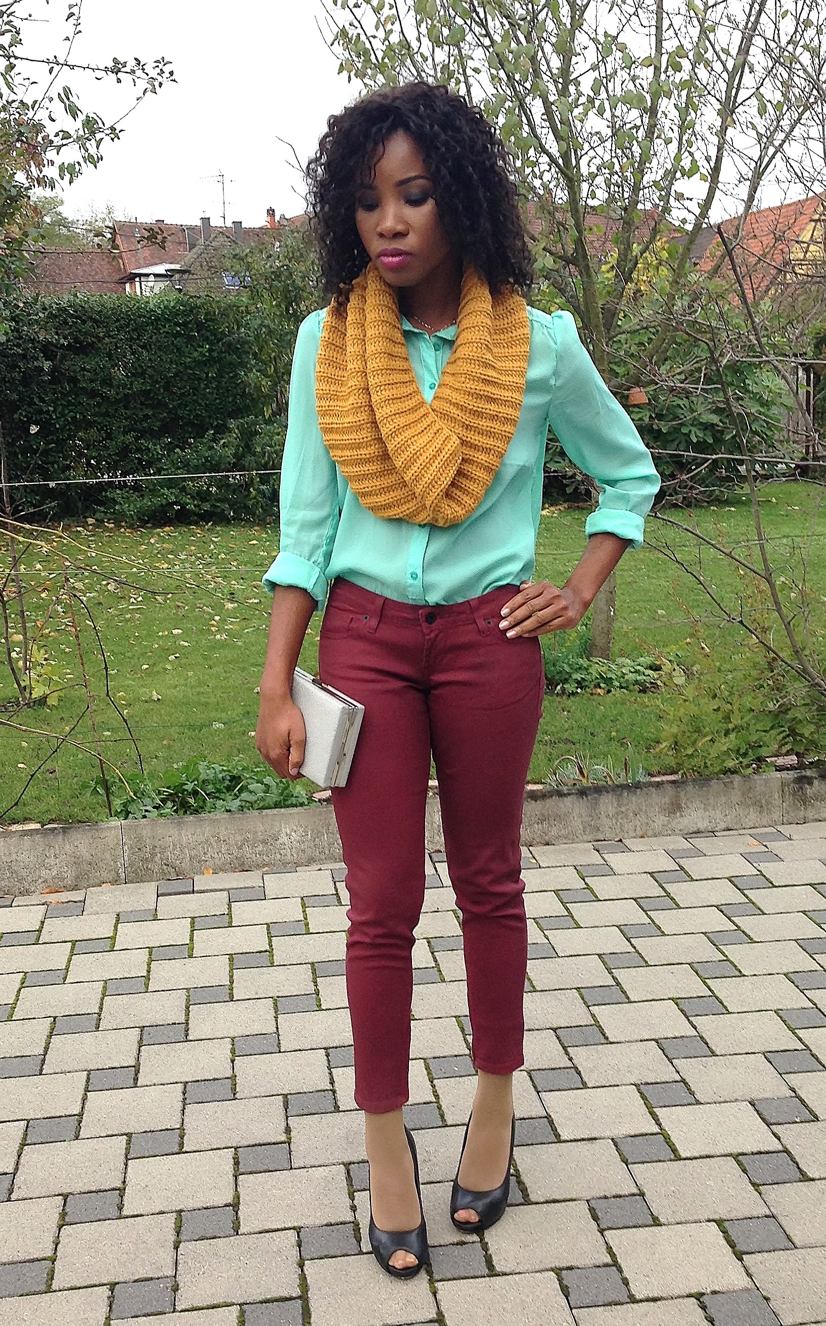 Burgundy and mustard bring out the spring and winter in me, but of course for my love for bright colours and always having a twist in my outfit, in this post is my mint shirt. I love bright colours and I wear them in all seasons. I complemented the look with this lovely silver clutch and a black pumps. I will say, this is my spring/winter colour blocking. I kept my jewelleries simple.