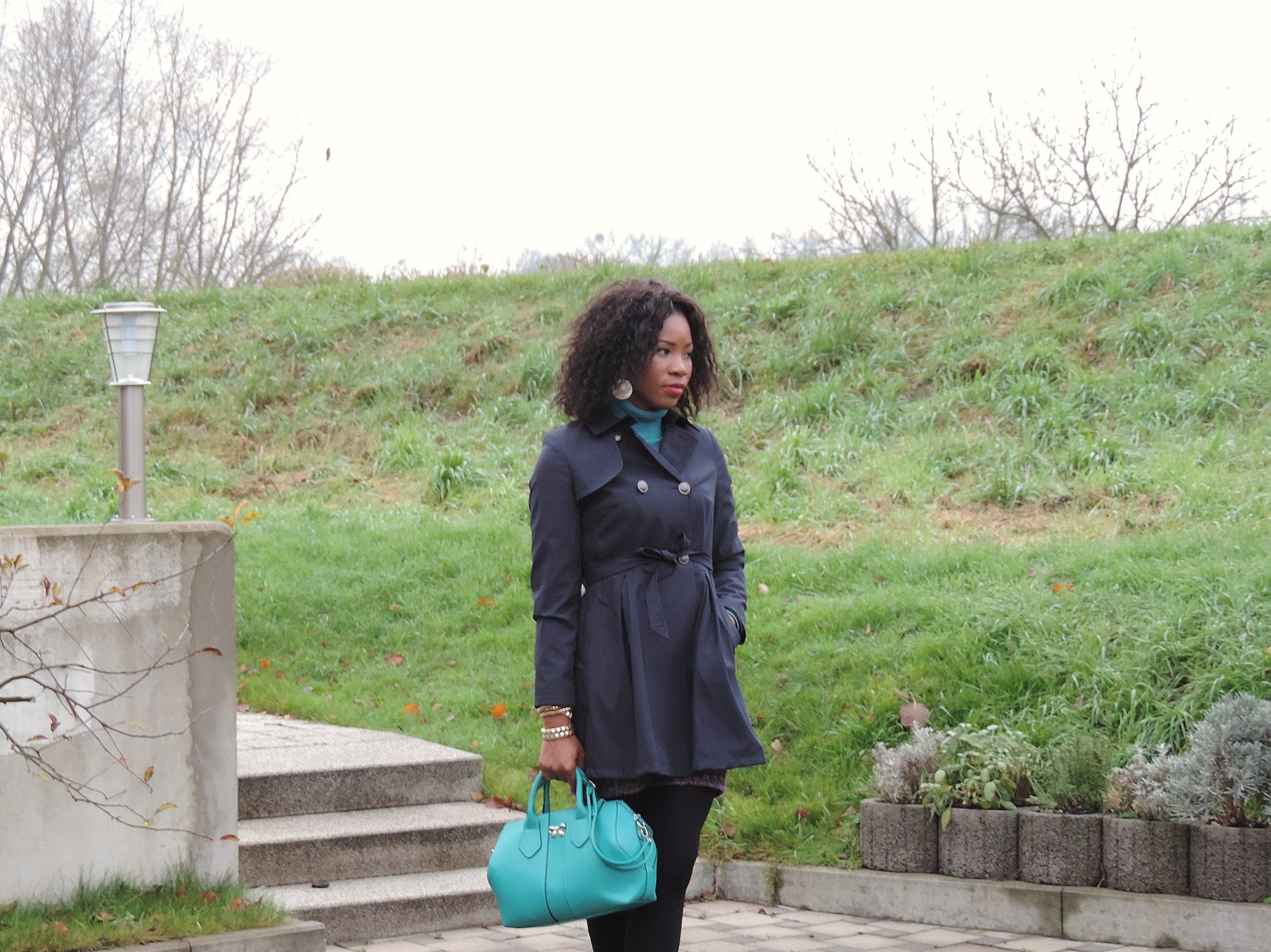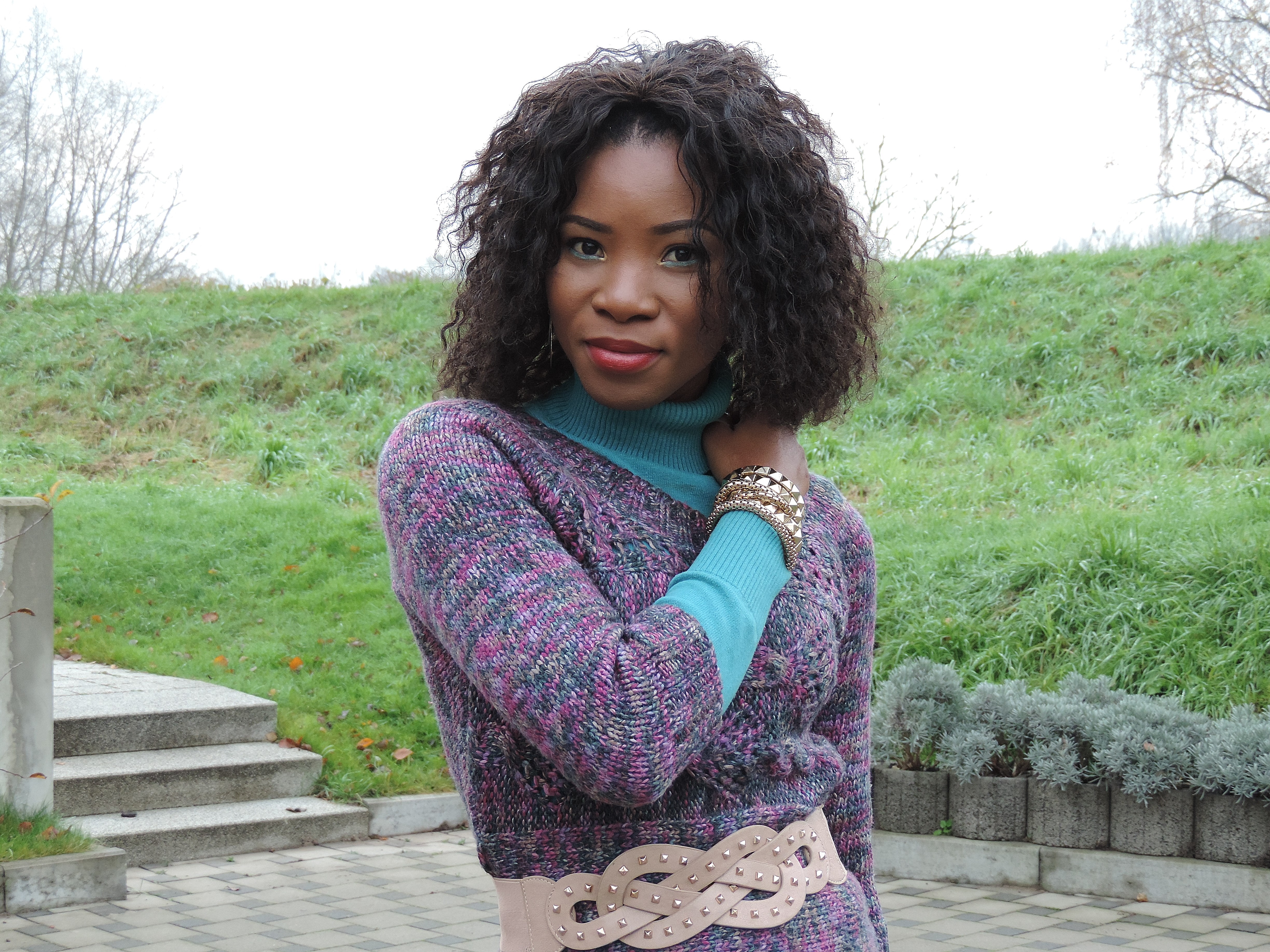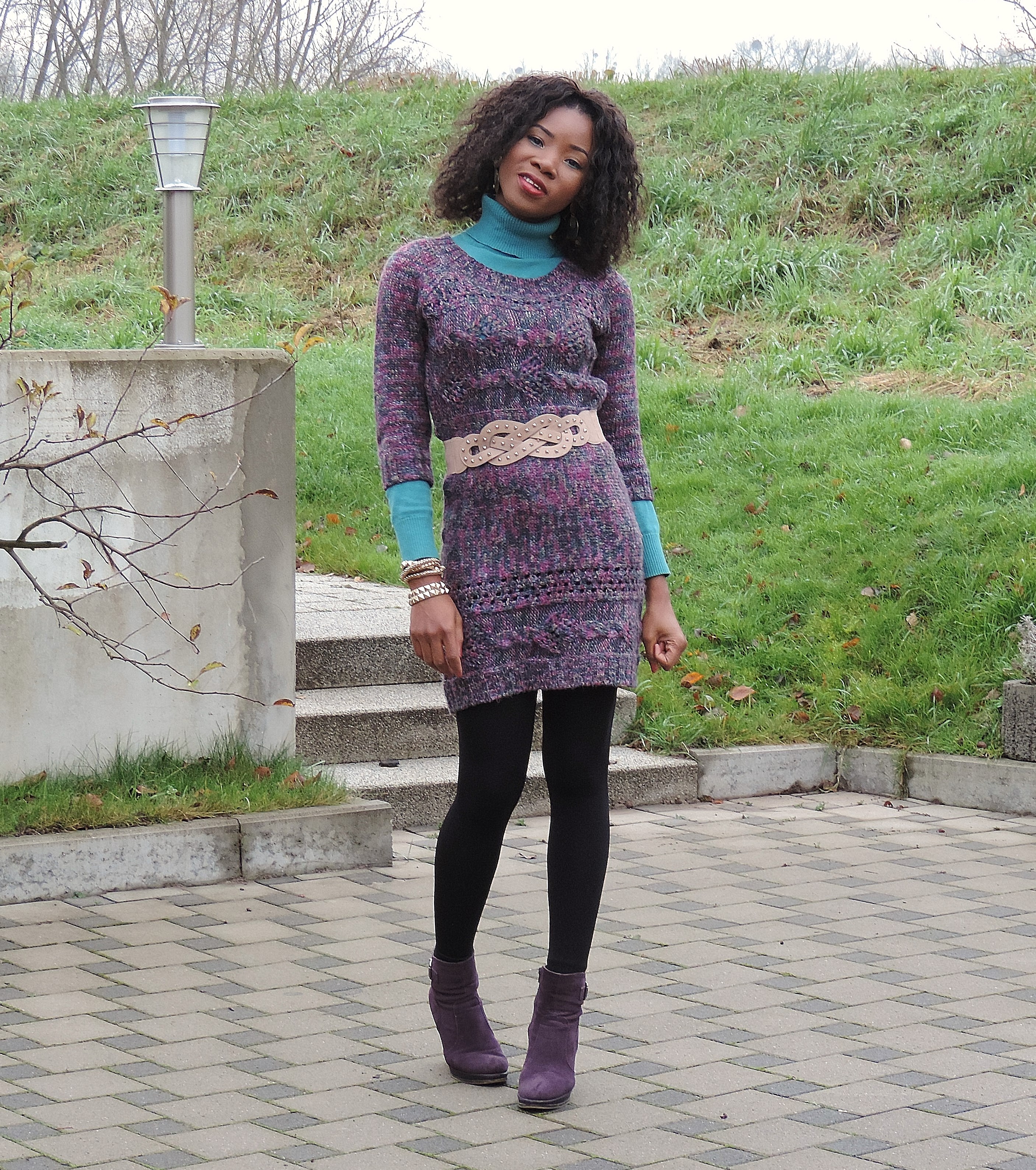 In this post, I am wearing one of my favourite sweater gown. Love the knitting combination of purple and a little bit of turquoise, brown and milk colour to it. I complimented the gown with a turquoise pullover and handbag to enhance the purple colour of the gown. On my feet, I wore an ankle boot (old and loving it) and finished the look with golden accessories and a belt to enhance the curves. Not forgetting the cold, I had to wear my all time coat from Primark.
