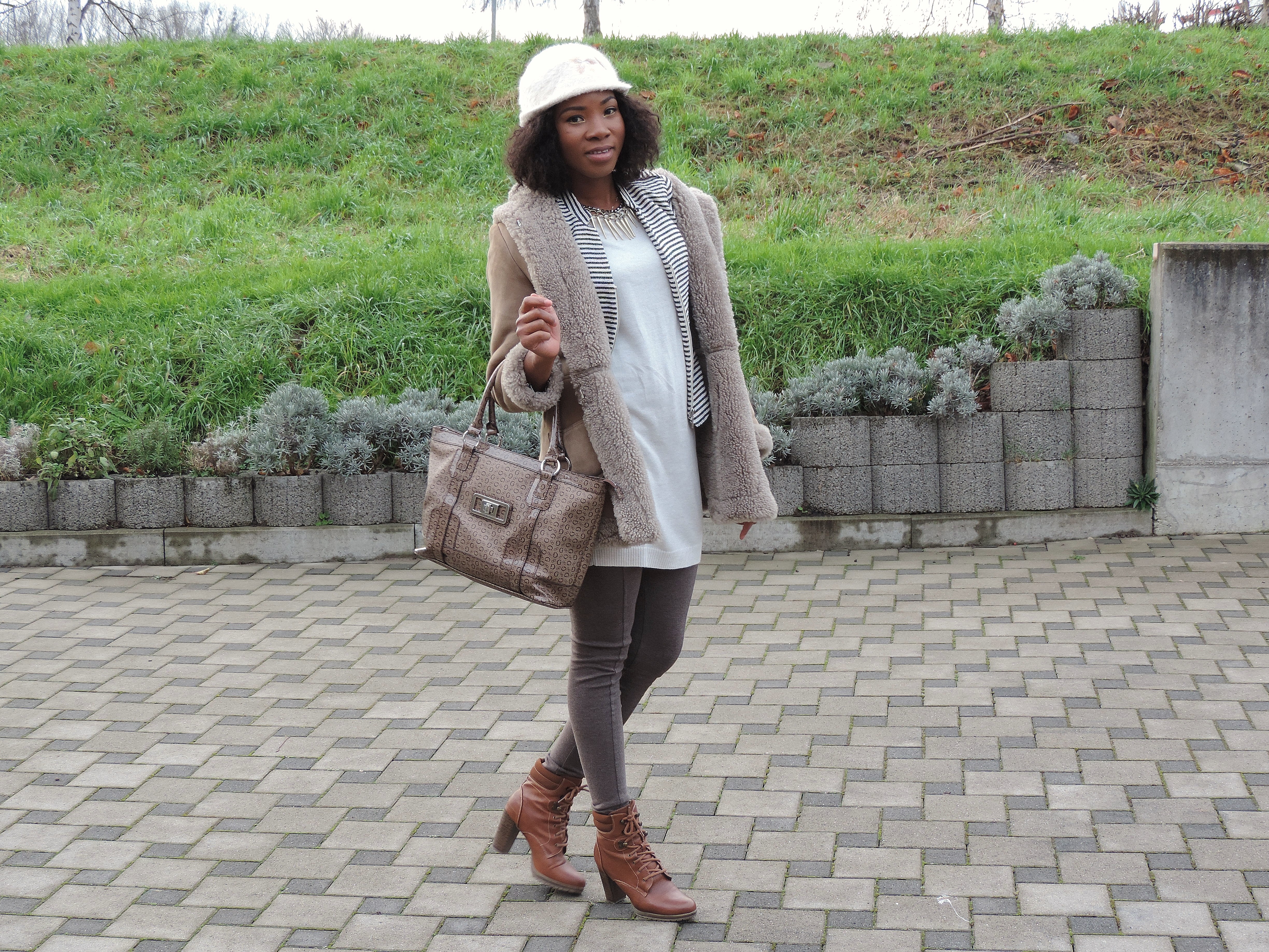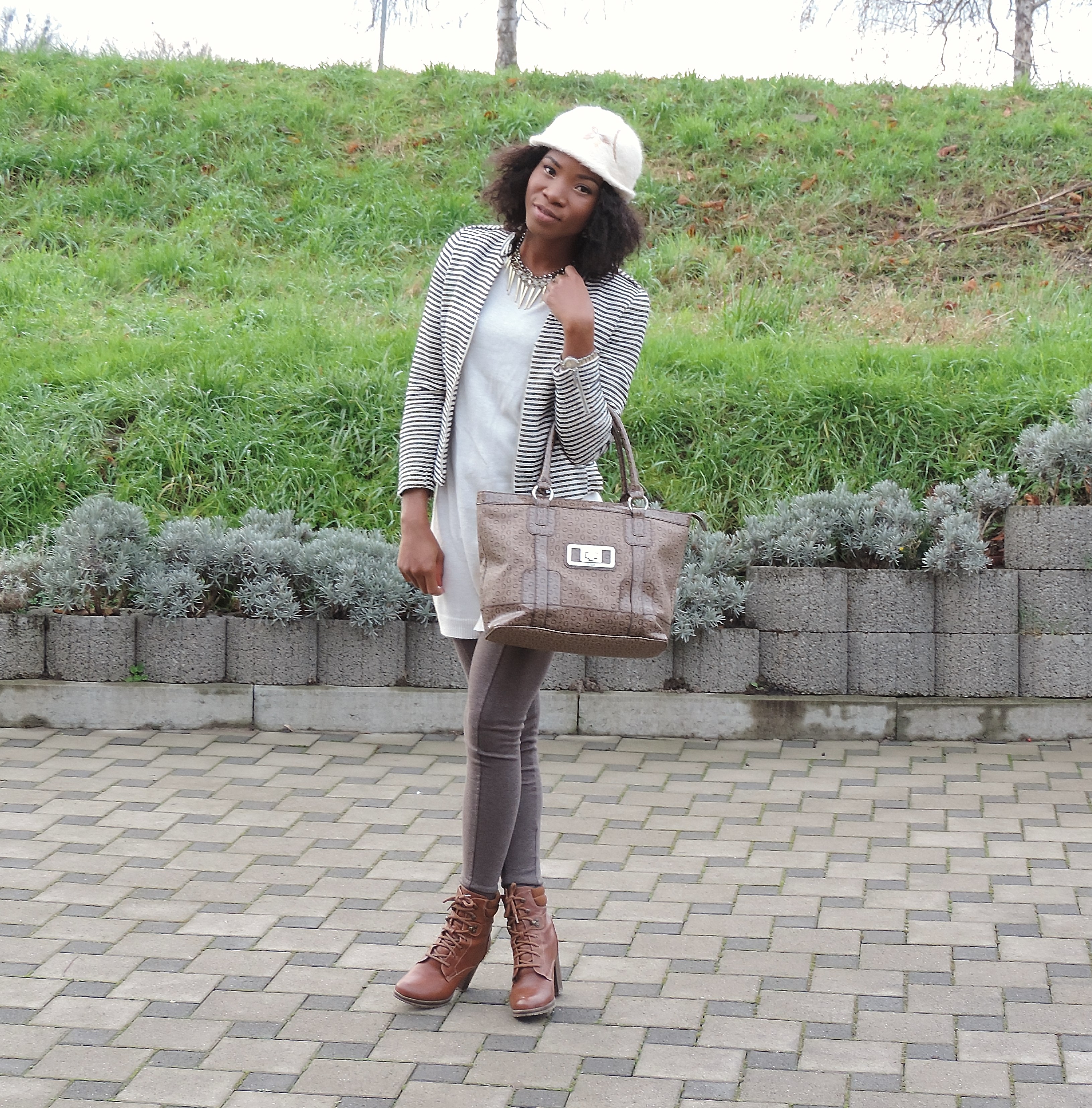 As we are still in the spirit of celebration, the outfit in this post can go with so many events. The combination of the neutrals with the black & white strips makes it so perfect to be worn in all seasons. For the cold weather, I complimented the look with this lovely coat which keeps me warm each time I wear it. For my head, I went with this hat instead of the normal winter cap to give it a more sophisticated finishing. For the accessories, I kept it at a minimum.