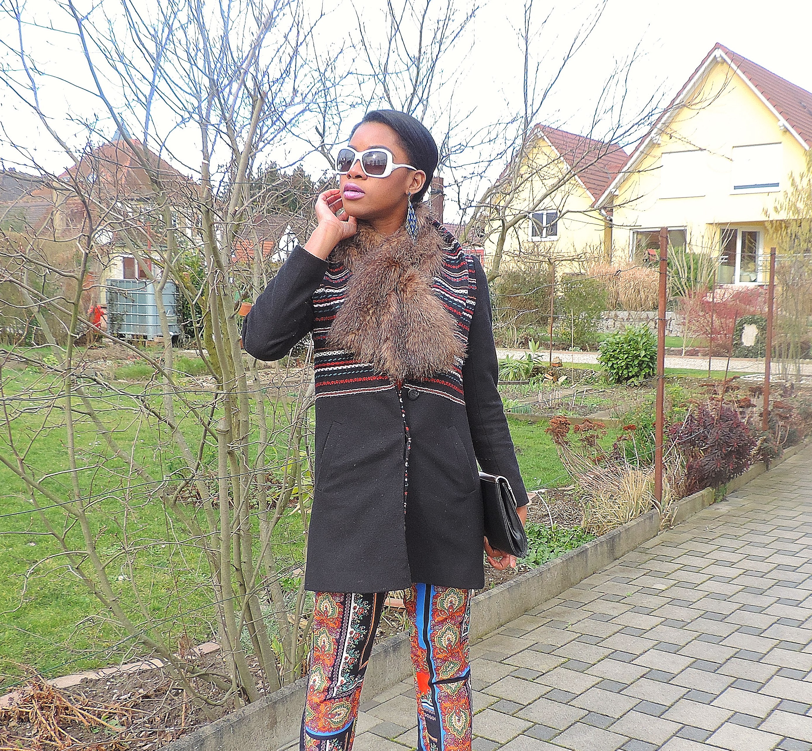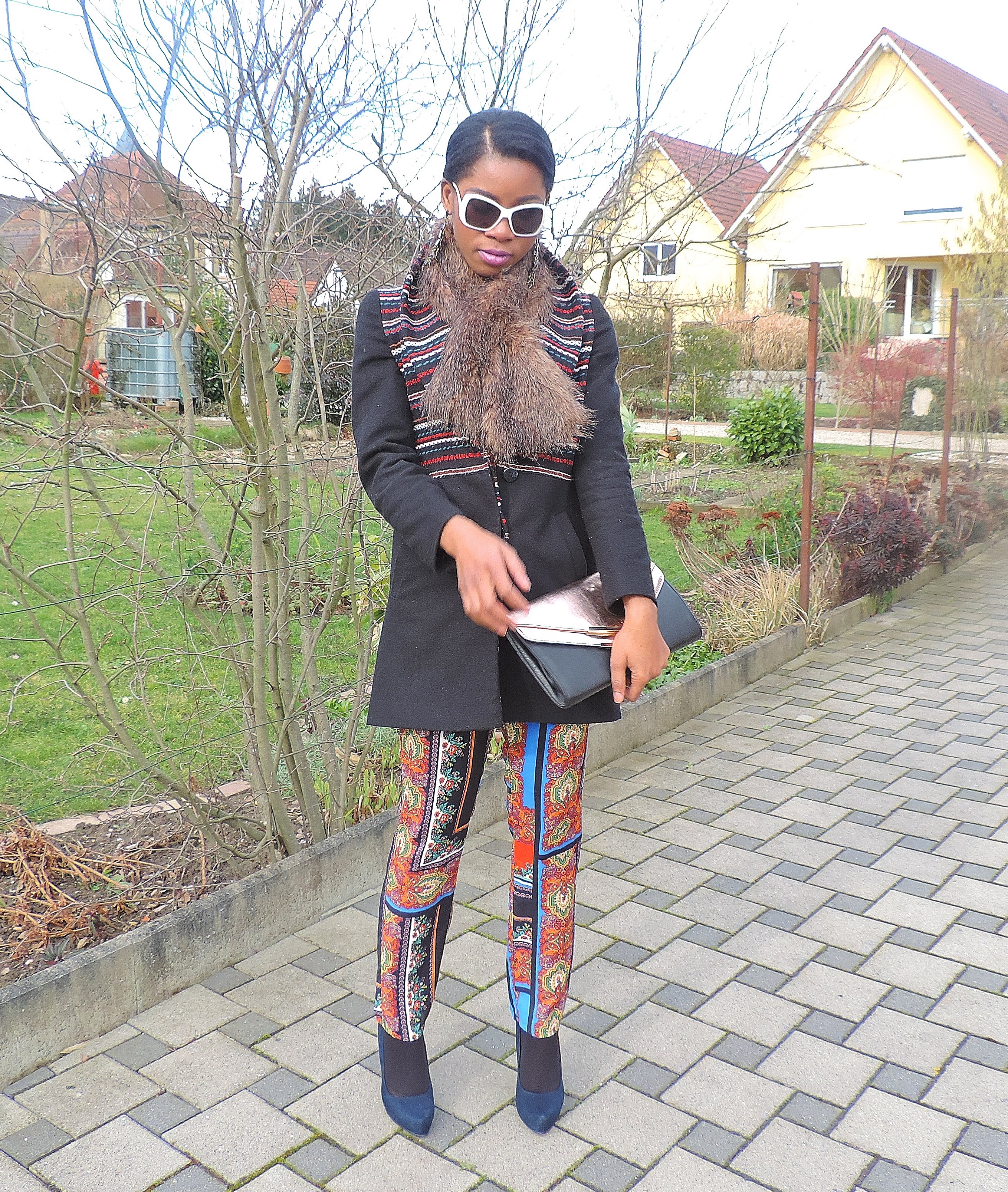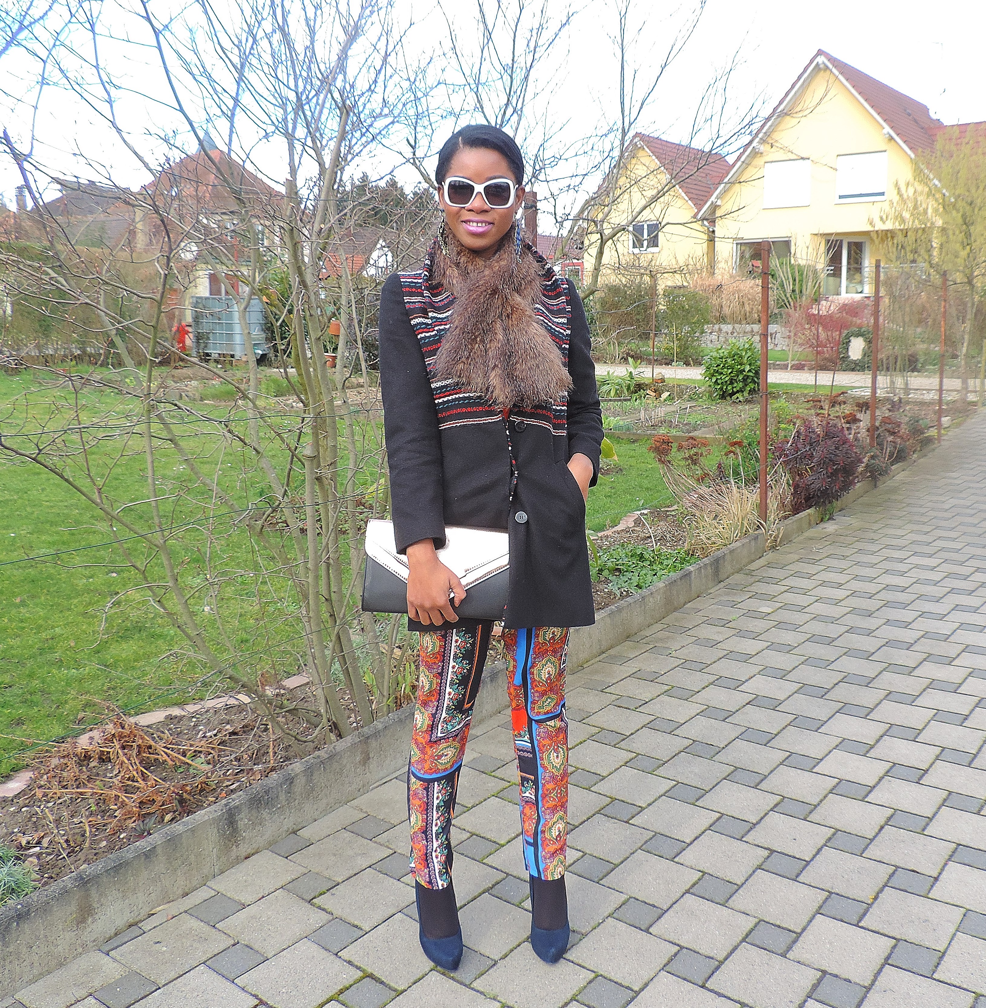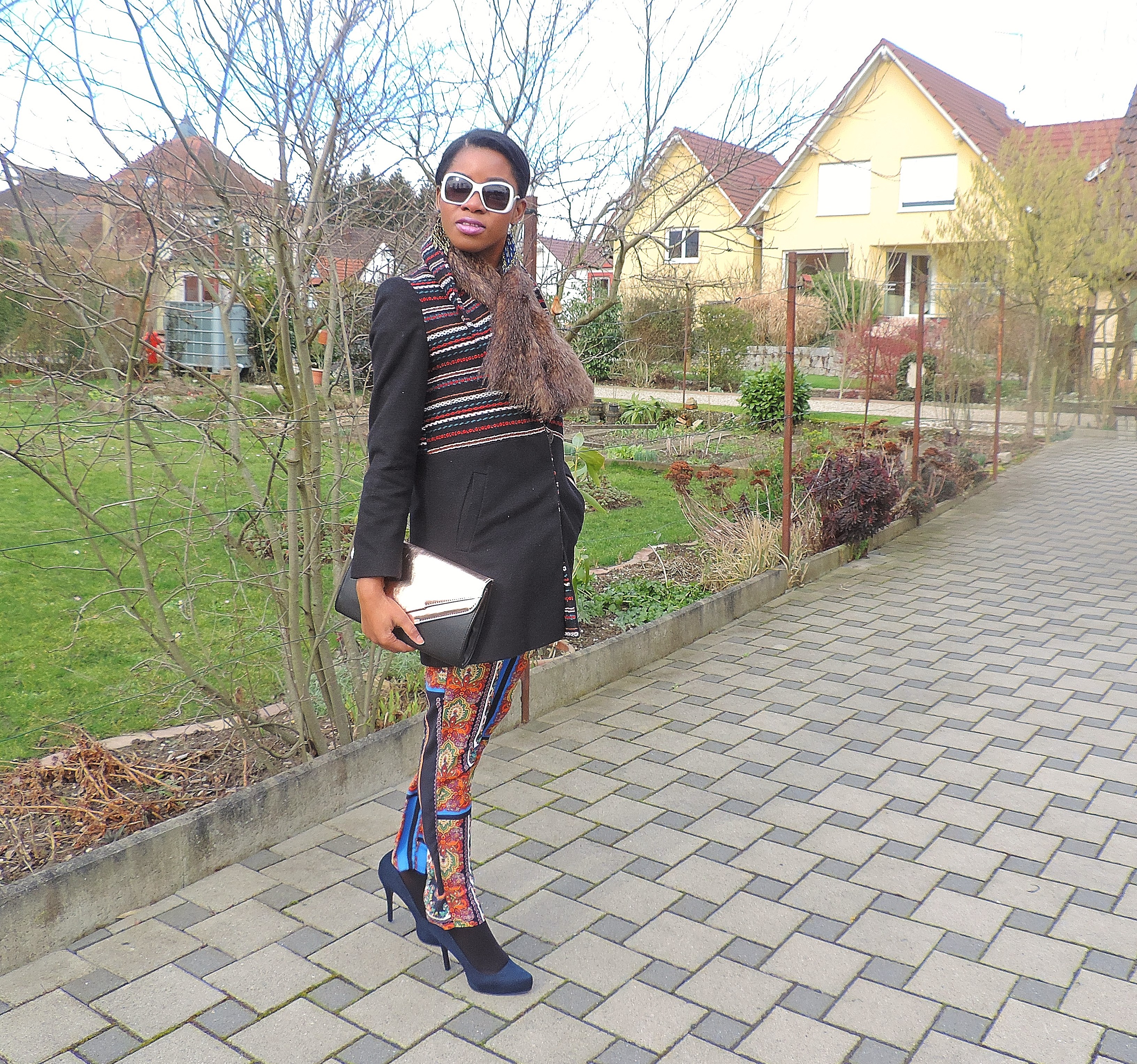 This was an outfit I wore to church. The pant was the main focus for this post and I complemented it with colours from the prints on the pant. To make the outfit standout and bold, I went for my orange shirt-top and my stripe Coat. Finishes up with my fur neck warmer and my dark blue pumps. This outfit is all about mixing and matching colours and prints together.