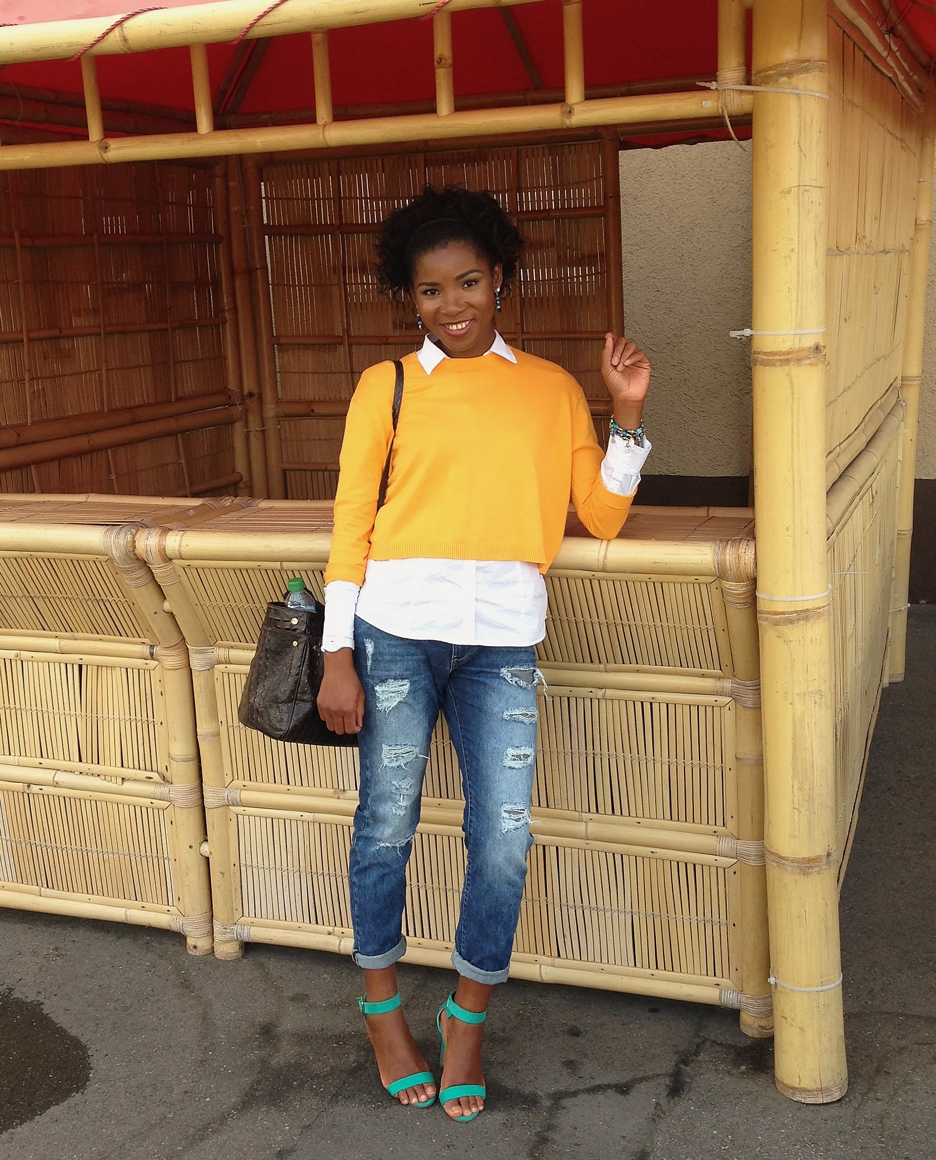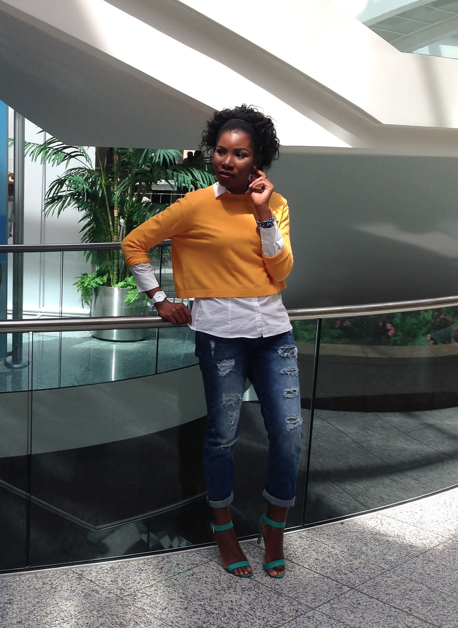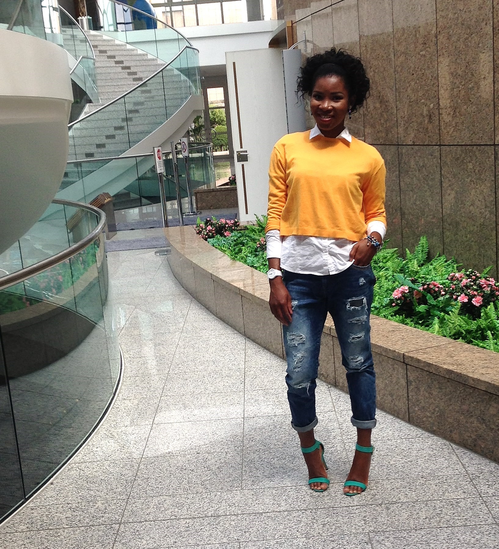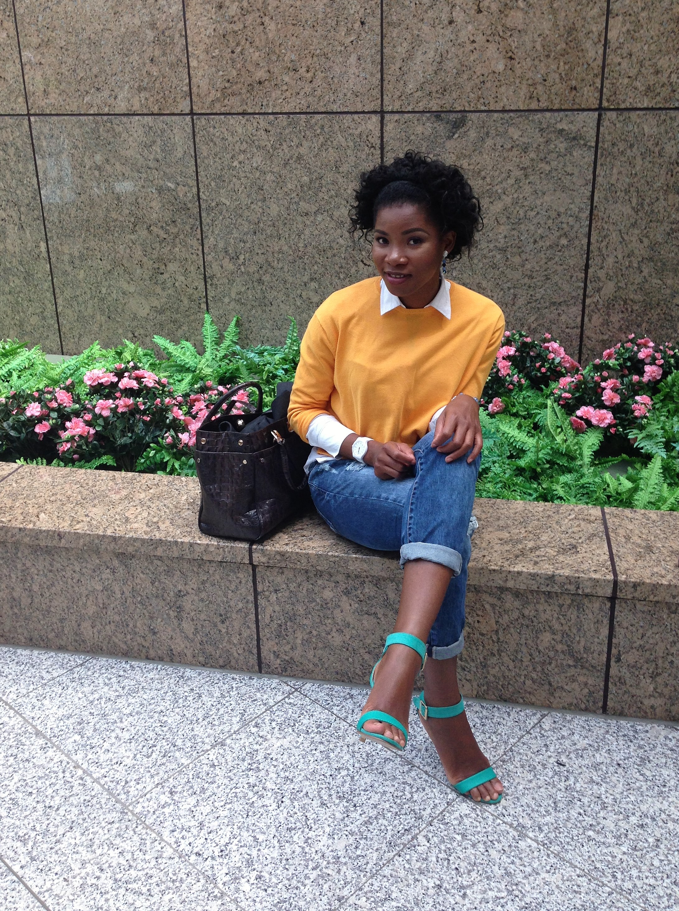 Today’s blog post is another comfortable outfit that can be worn to work or to an occasion. My plan was to wear the jeans with the shirt alone, but since the weather was cold I wore a sweater over it. For a pop of colour, I complimented the look with a green shoe and a yellow Sweater.