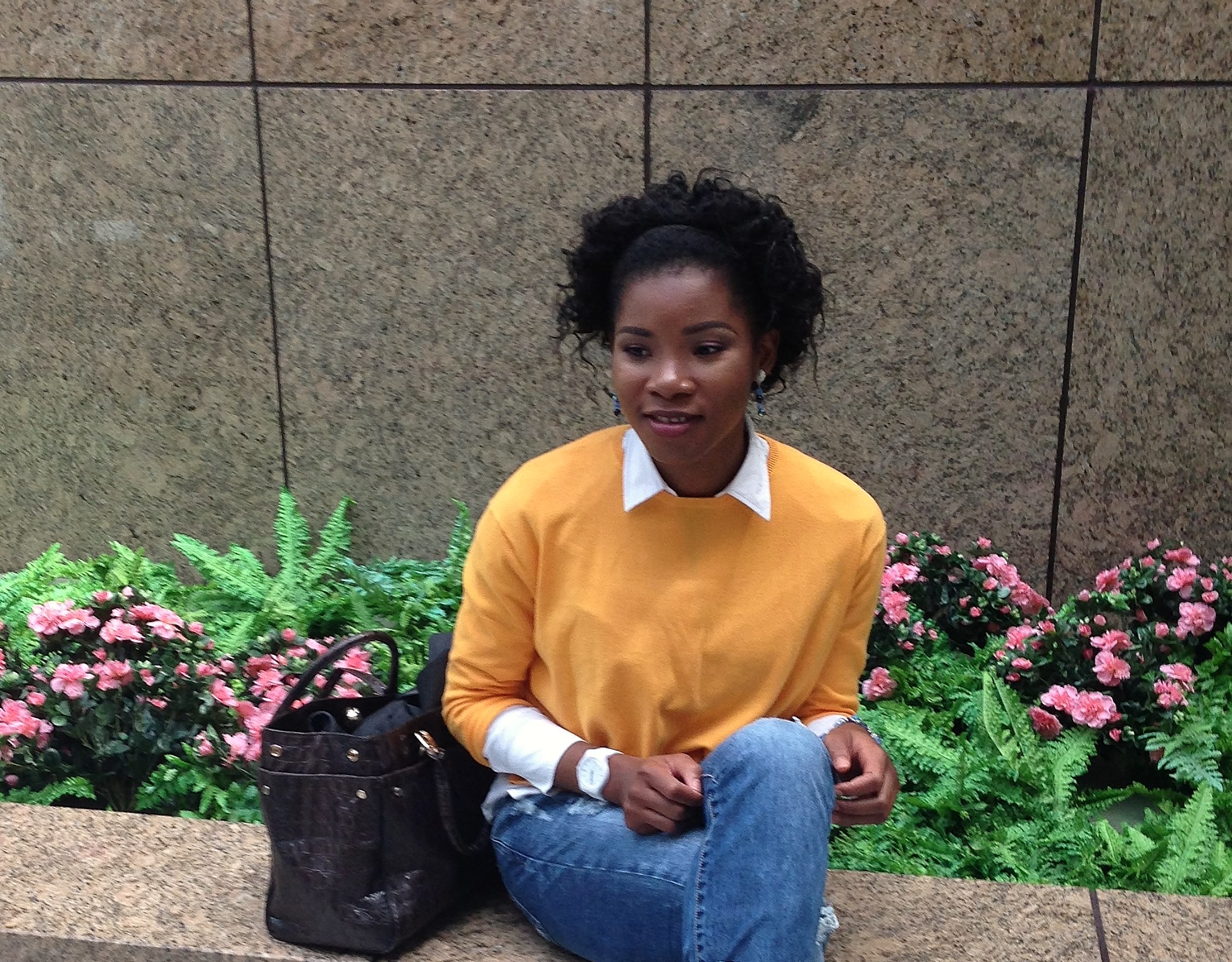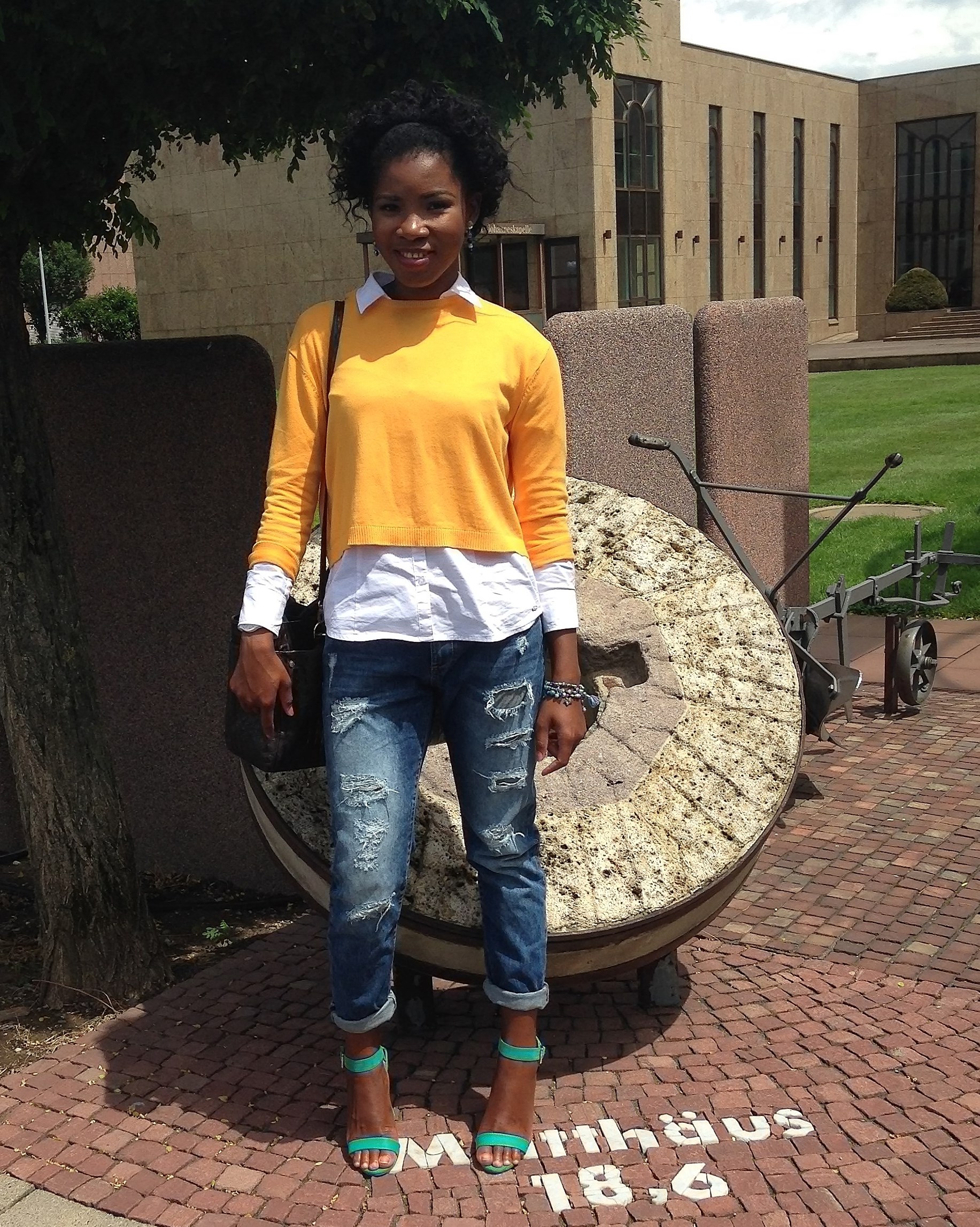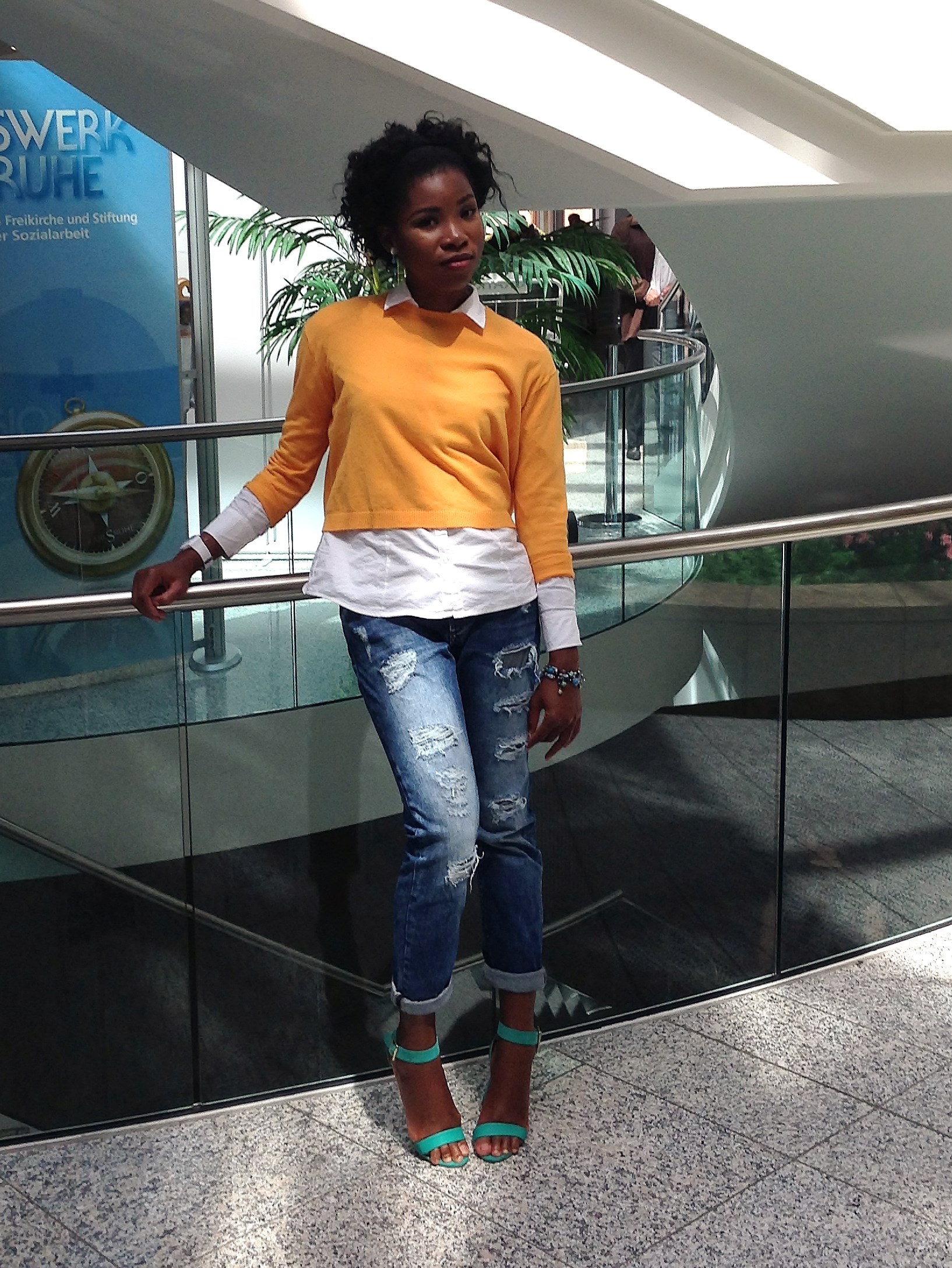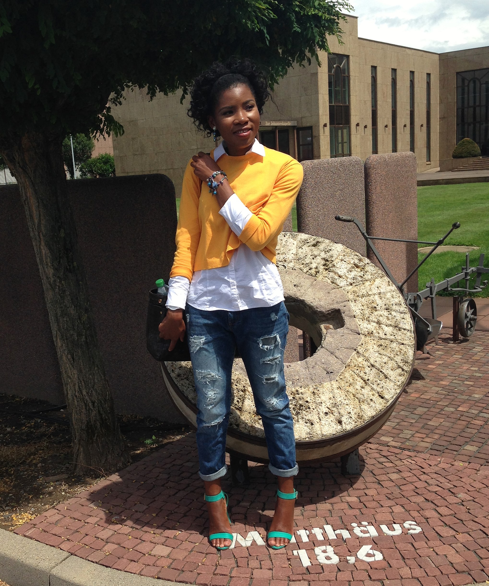 Today’s blog post is another comfortable outfit that can be worn to work or to an occasion. My plan was to wear the jeans with the shirt alone, but since the weather was cold I wore a sweater over it. For a pop of colour, I complimented the look with a green shoe and a yellow Sweater.