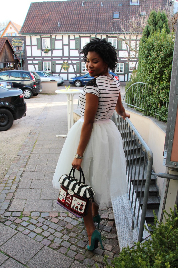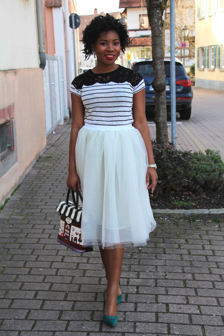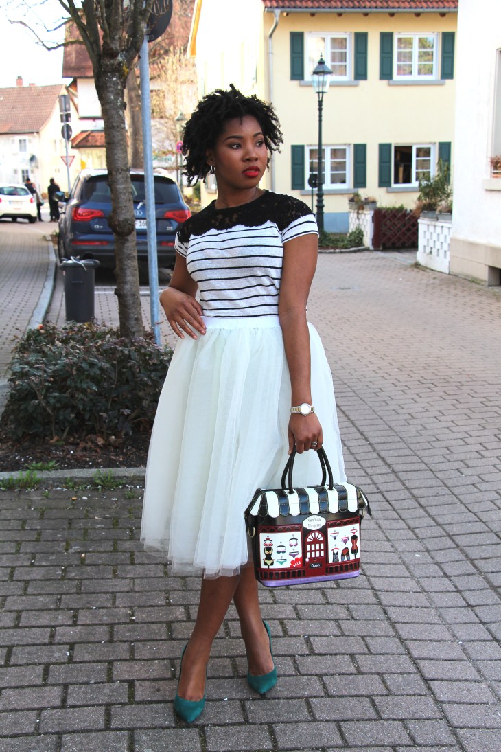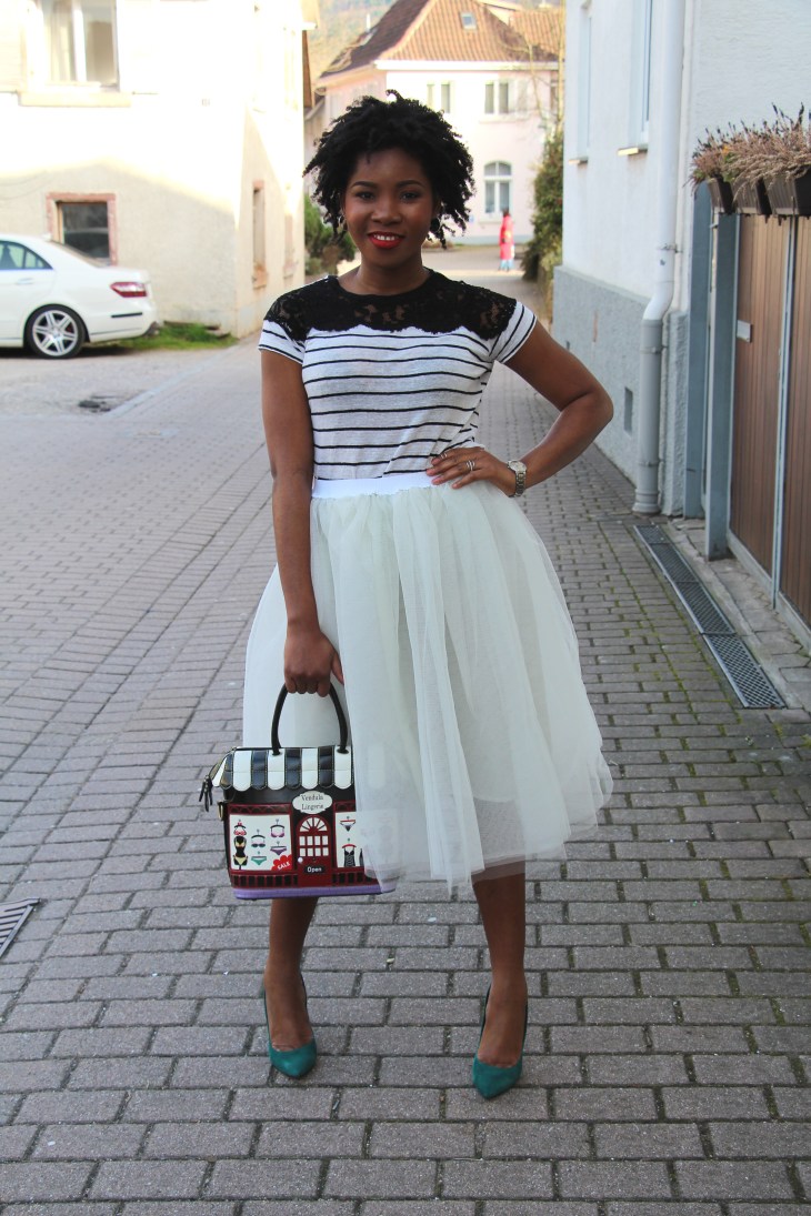 Tull skirt is one of my spring must have, because it can easily be styled for a casual or formal event. For today’s post, I was going for something between casual and party look, wearing our Tull Skirt in cream colour. The green pumps and bag added some colour and fun to the entire look. That’s what Spring is all about, playing with colours and patterns.